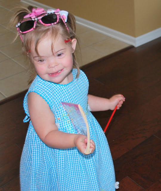 Sarah brings us so much sunshine daily, that she must wear shades indoors. This afternoon, I was playing a matching game with her and the kids, when she put on these glasses. She continually wore them for the next half hour, even though they kept breaking. We all were laughing as she would look up at us with serious face.